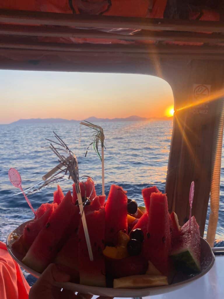 Öğle saatlerinde teknemizde hazırlanan taze ve lezzetli yiyecekler eşliğinde deniz manzarasının tadını çıkarıyoruz. Yöresel mezeler, taze balık ve ızgara seçenekleriyle damak zevkinize hitap eden bir öğle yemeği sizleri bekliyor.